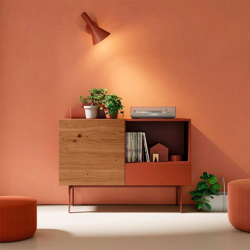 Aparador con 1 puerta de madera de roble viejo con estante interior de madera, 1 hueco y 1 cajón; lacados en color teja. Patas metálicas en lacado teja. Tirador T.