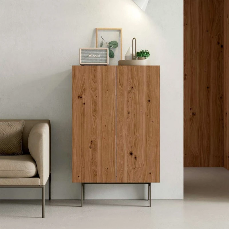 Aparador alto con 2 puertas de madera de roble tostado y patas metálicas en lacado topo mate. Tirador T. 4 estantes interiores de madera.