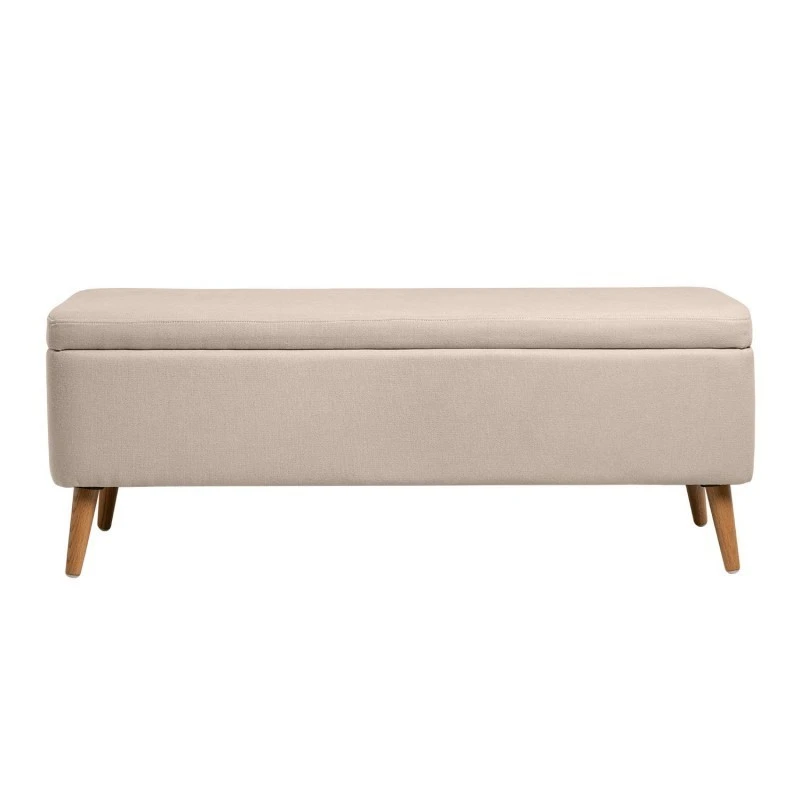 Banqueta NITRA con asiento elevable, tapizada en tela color baige y patas de madera.