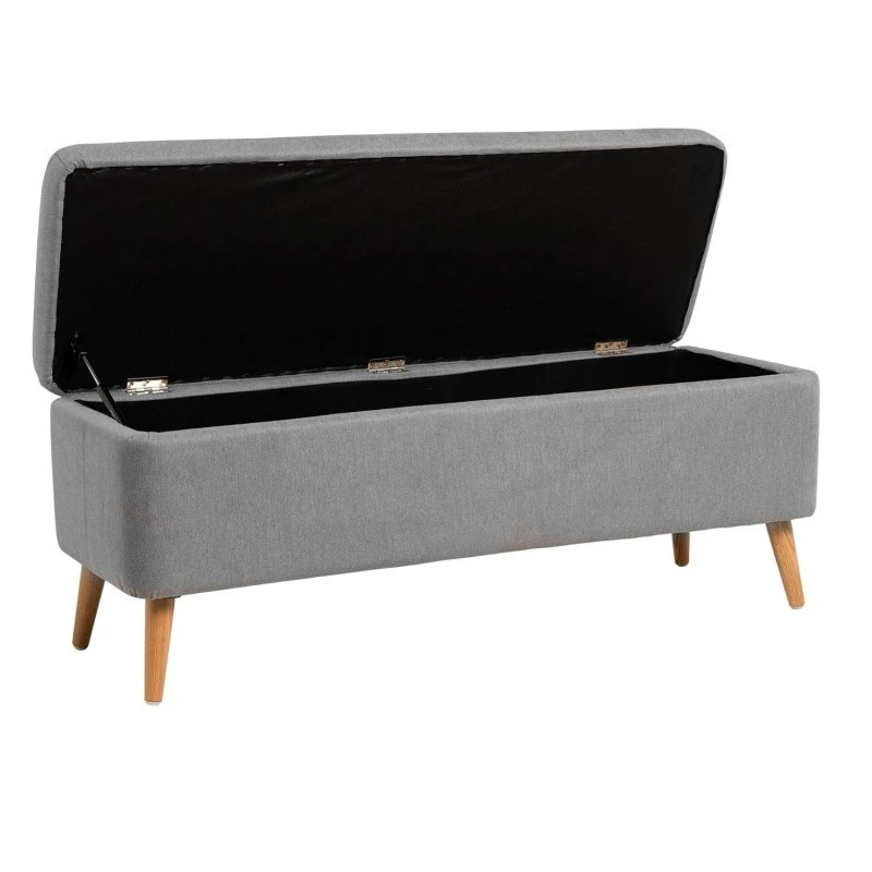 Banqueta NITRA con asiento elevable, tapizada en tela color gris y patas de madera.