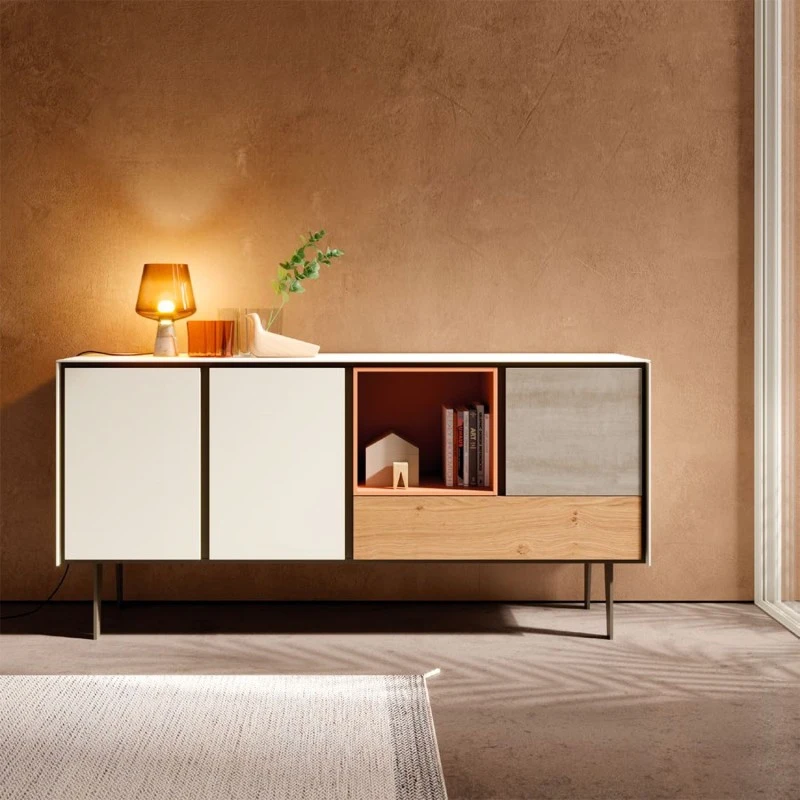 Acabado foto: Cristal Perla Mate, Lacado Perla Mate, Lacado Duna Mate, Chapa Roble Nudoso, Lacado Topo y ceráica Blaze Grey.