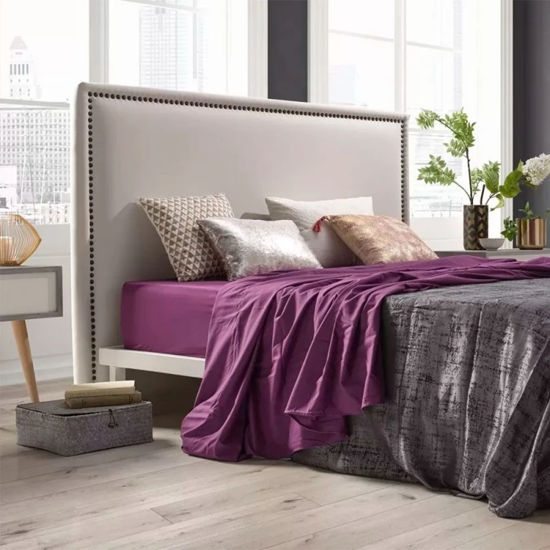 Cabecero tapizado Berlín con Tachuelas. Tapizado en tela Bronx. Pensado para gente que busca crear un ambiente ante todo elegante, sereno y limpio, totalmente recto cuenta como único detalle con la tachuela puesta a mano.