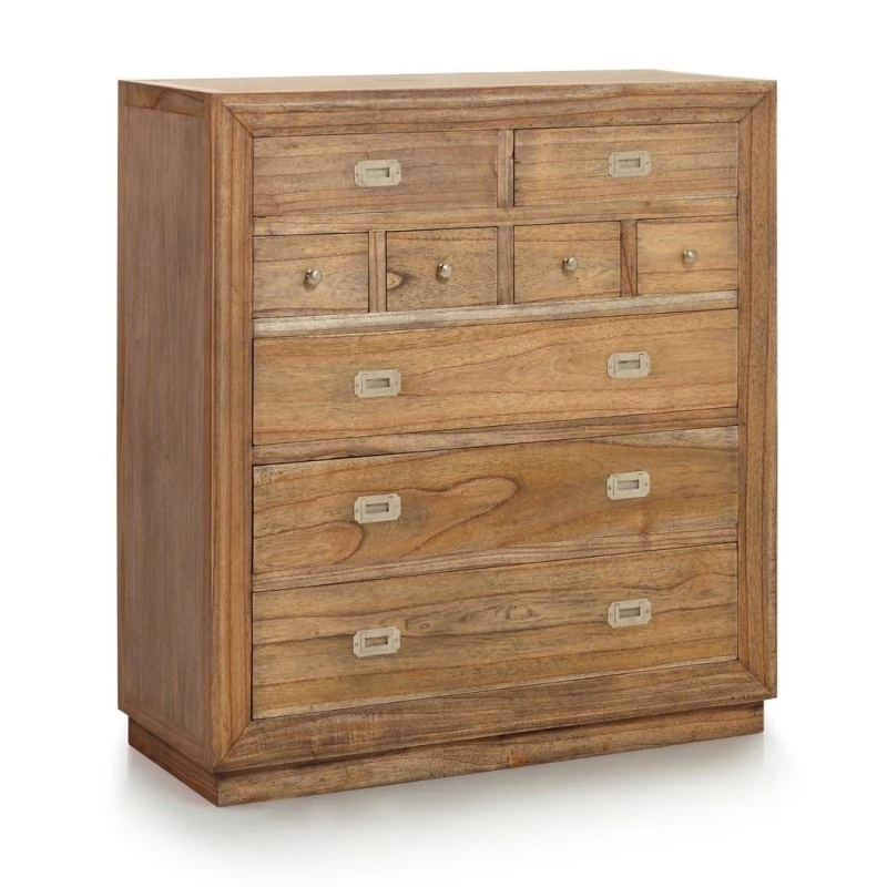 Cómoda de estilo colonial con 9 cajones. Fabricada en madera de mindi con acabado natural.
