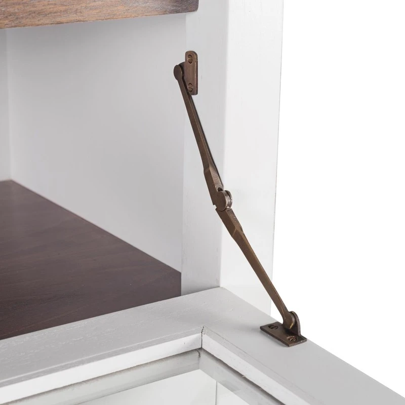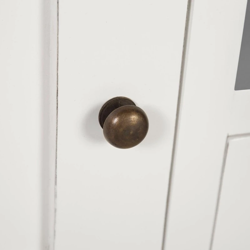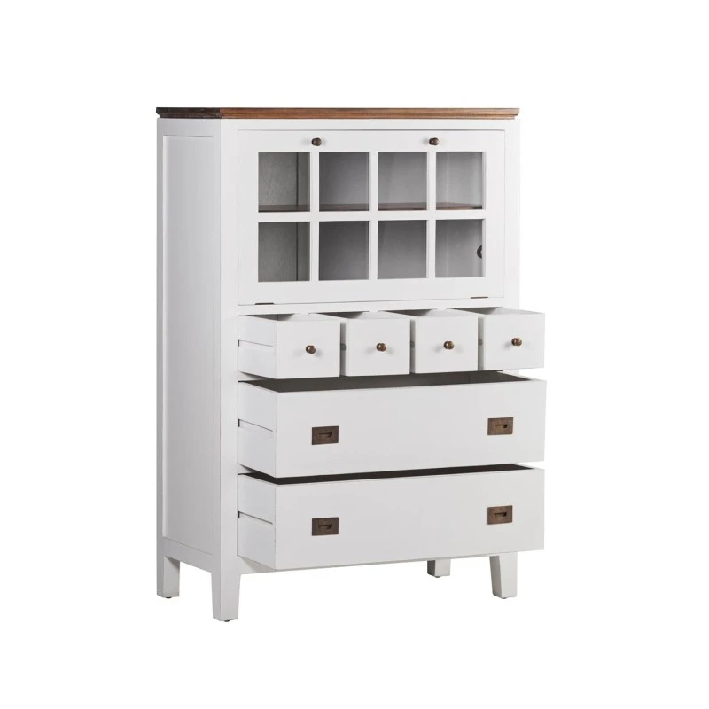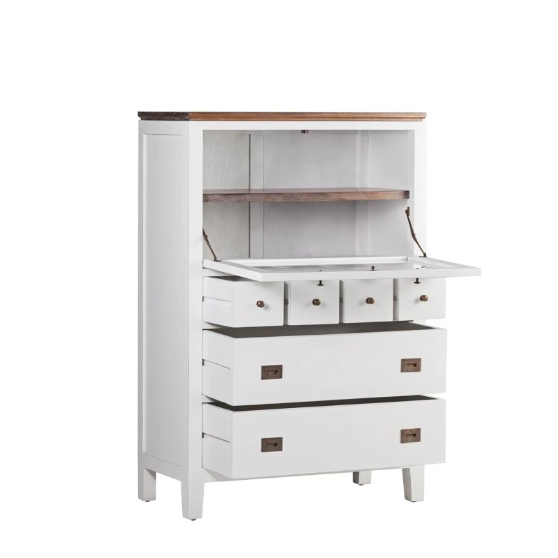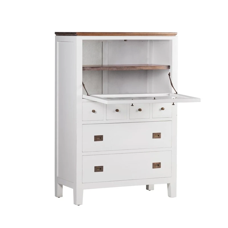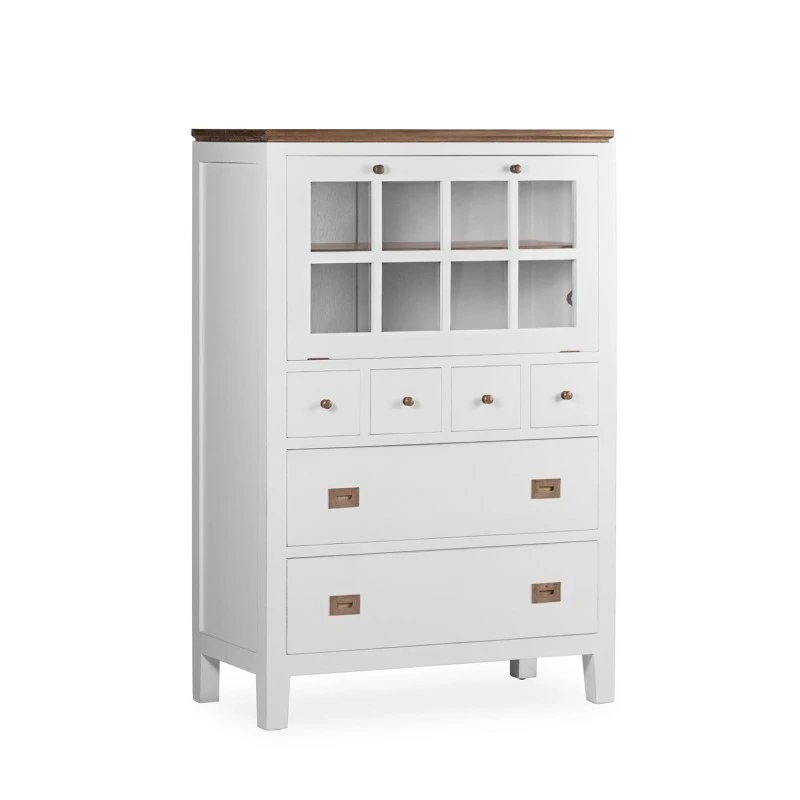 Cómoda alta blanca de estilo colonial Everest con 6 cajones, 1 puerta abatible y estante. Fabricada en madera de mindi.