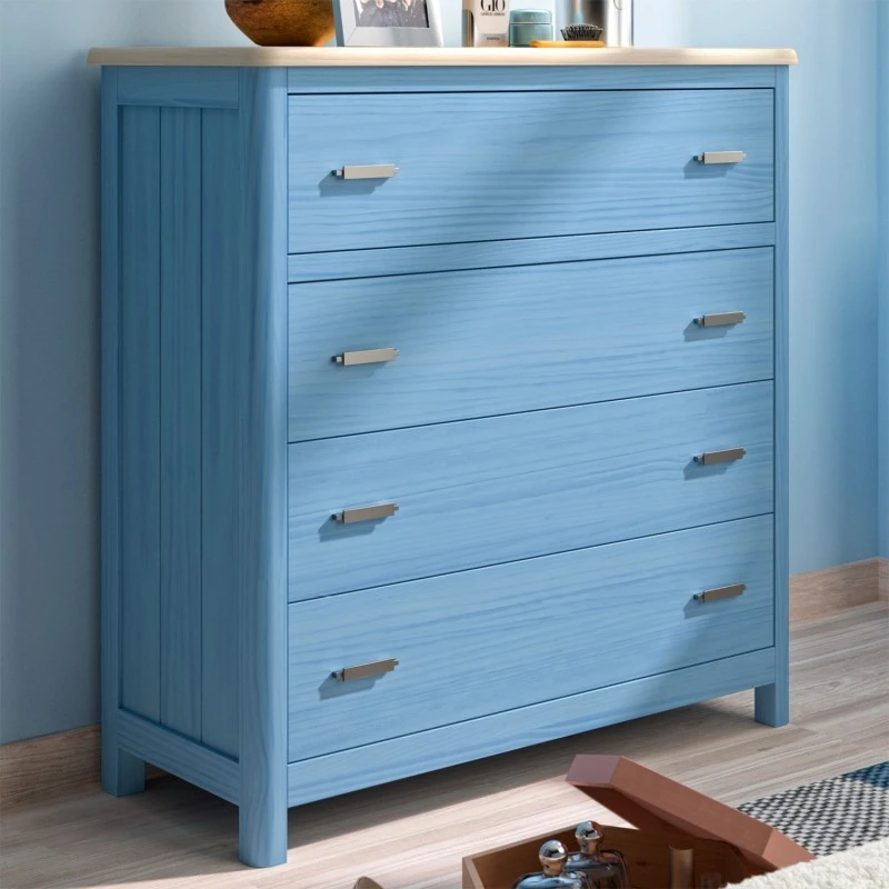 Cómoda rústica Cerdeña con 4 cajones. Fabricada en madera de pino. Acabado del mueble en la foto: Natural/Azul cielo.