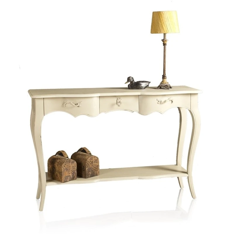 Consola de estilo francés fabricada en madera de caoba y tallada a mano. Dispone de 3 cajones con tiradores de hierro y balda inferior.