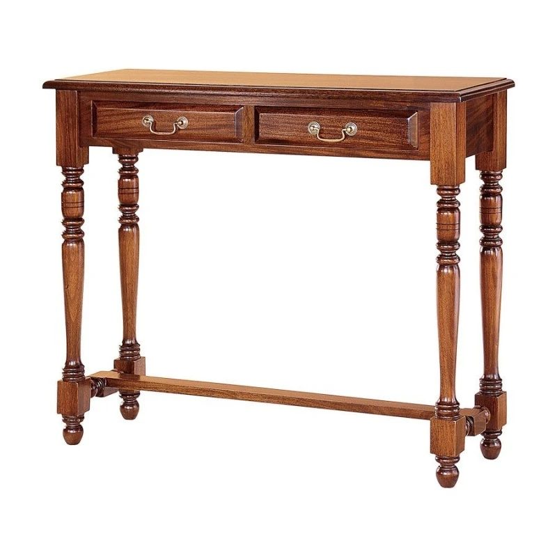 Consola clásica con 2 cajones fabricada en madera de caoba con acabado a la cera.
