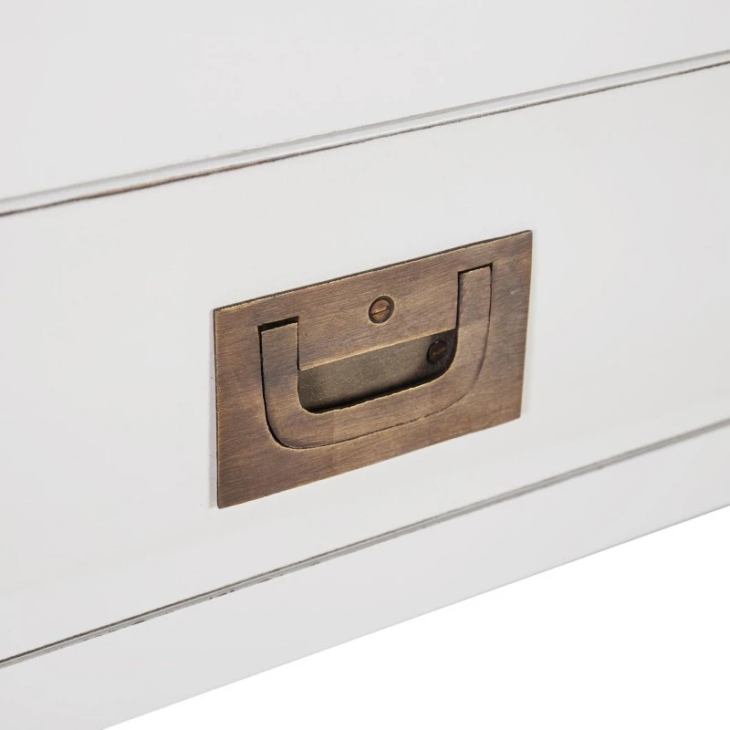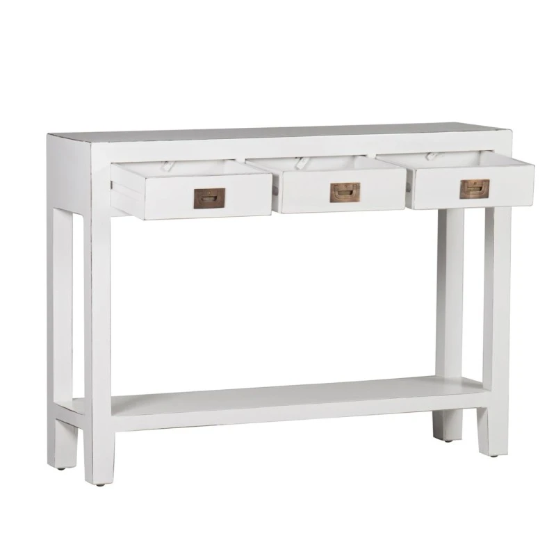 Consola blanca de estilo colonial Everest con 3 cajones y 1 estante. Fabricada en madera de mindi.