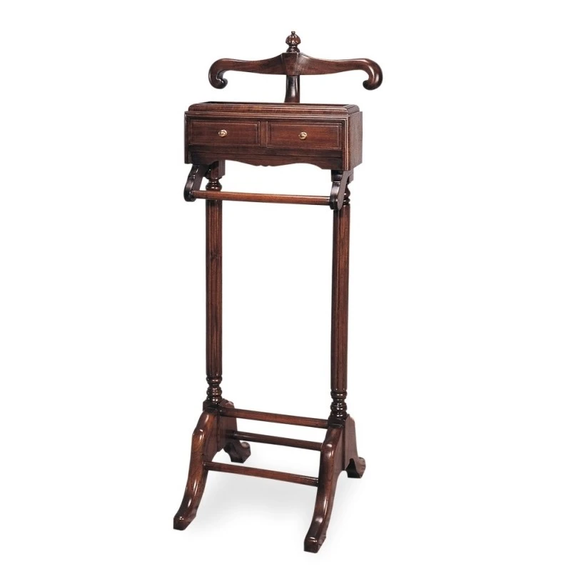 Galán de noche clásico con 1 cajón fabricado en madera de caoba con acabado a la cera en color nogal.