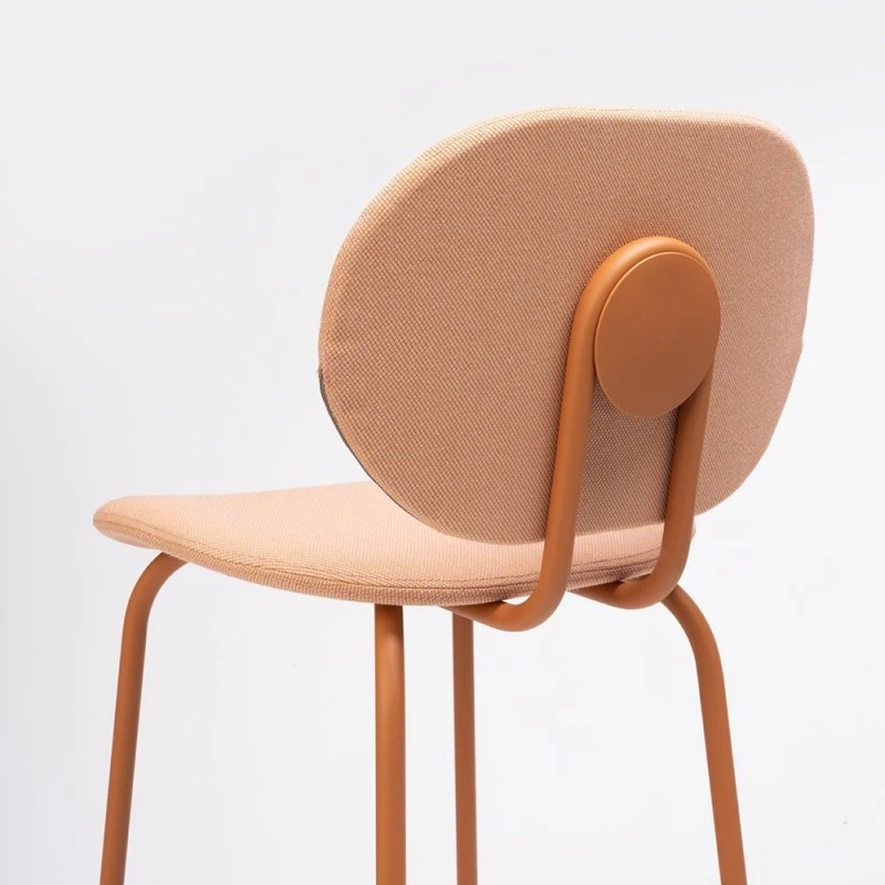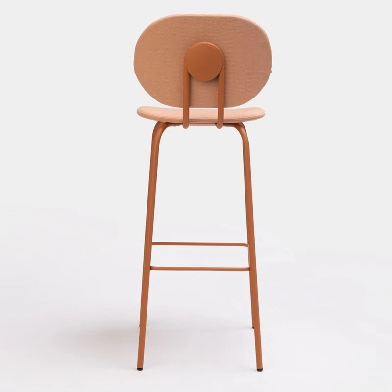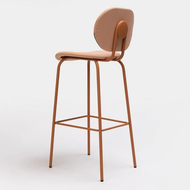 Taburete Hari con respaldo y asiento tapizado en tela o polipiel. Estructura metálica disponible en varios colores de lacado.