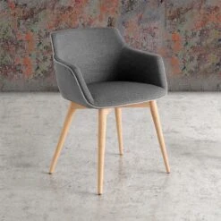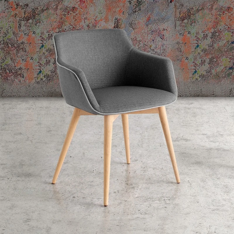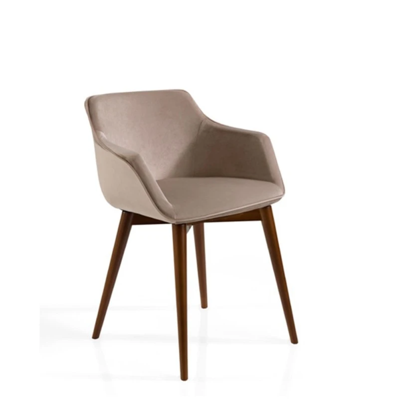 Silla de comedor moderna tapizada con brazos Jax con patas cónicas con estructura en madera de fresno. Se puede barnizar o lacar en cualquier color que se ofrece en el muestrario del fabricante.