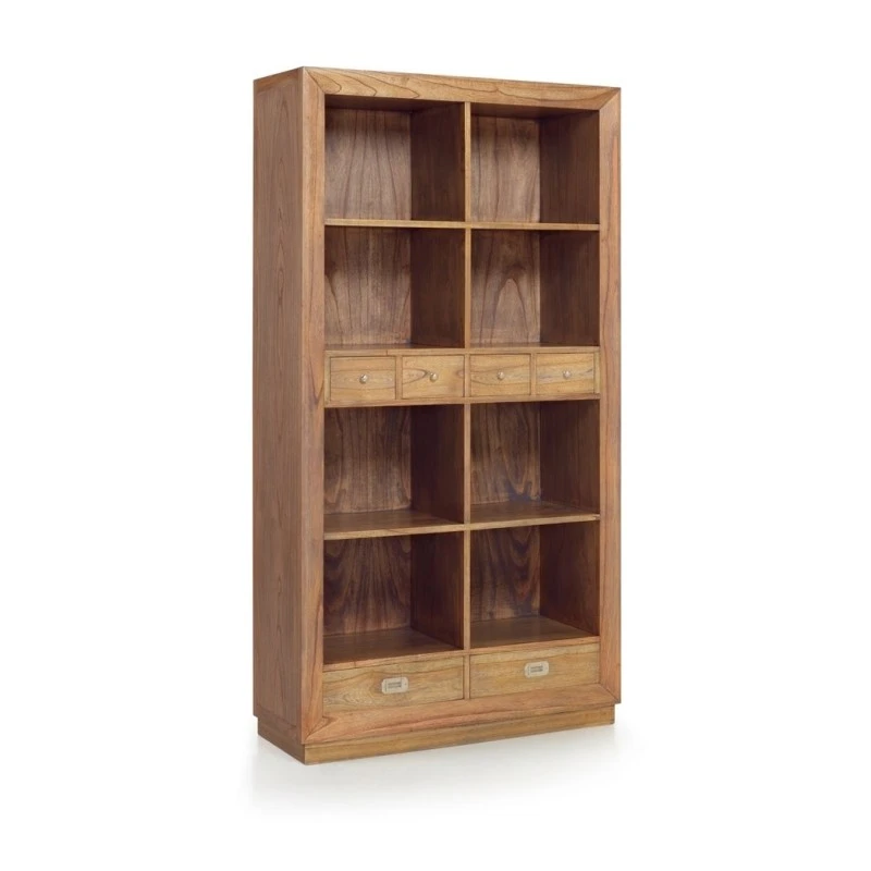 Librería de estilo colonial con 8 huecos y 6 cajón. Fabricada en madera de mindi con acabado natural.