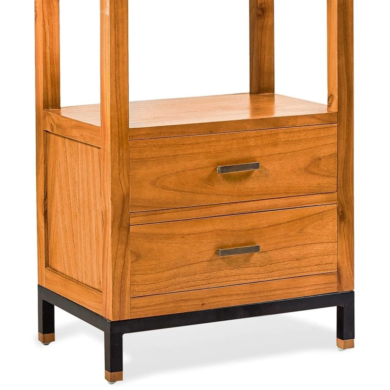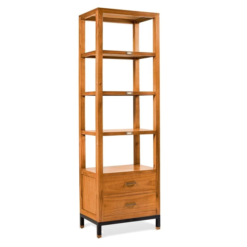 Libreria de estilo industrial con 2 cajones y 3 baldas, fabricada en madera de mindi con acabado natural. Patas metálicas pintadas en color negro con remate en color bronce.