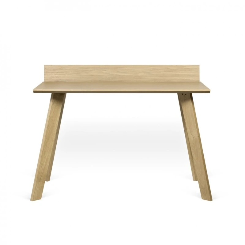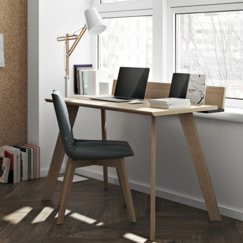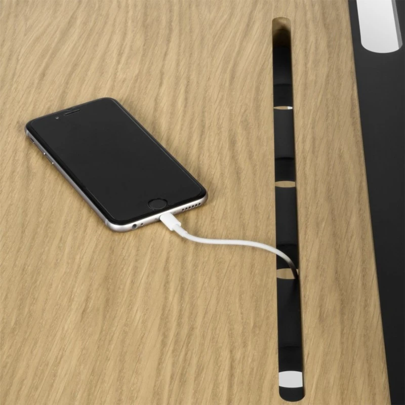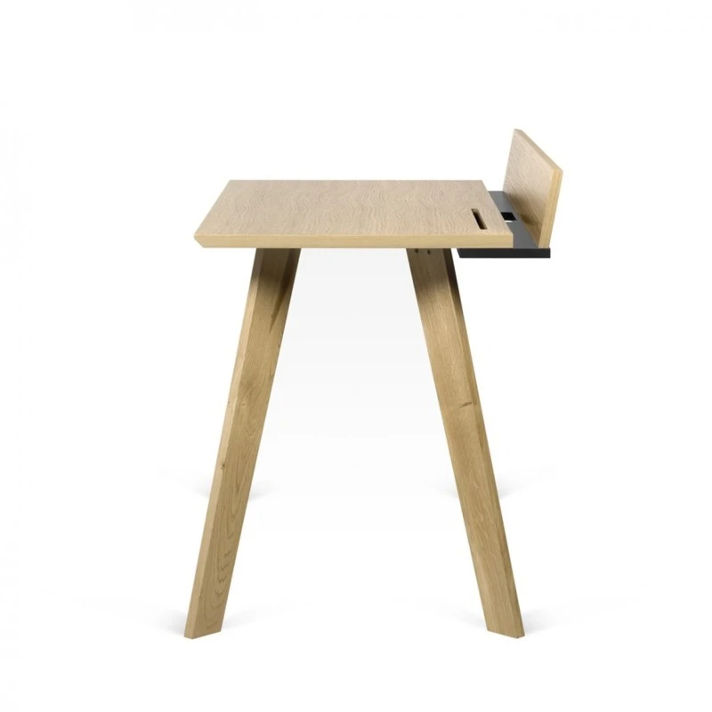Escritorio de estilo escandinavo con ranuras en la parte superior de trabajo para almacenar tabletas, telefonos moviles y ordenadores portiles.