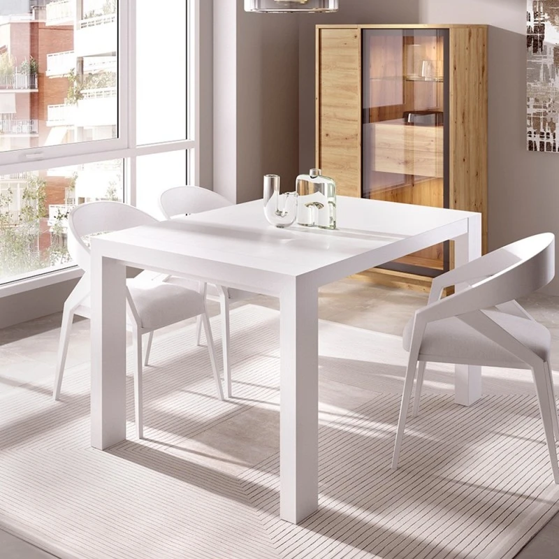 Mesa de comedor extensible a 175 cm en tablero de fibras recubierto de melamina de primera calidad. Disponible en 4 terminaciones. Acabado de la foto: Blanco poro.