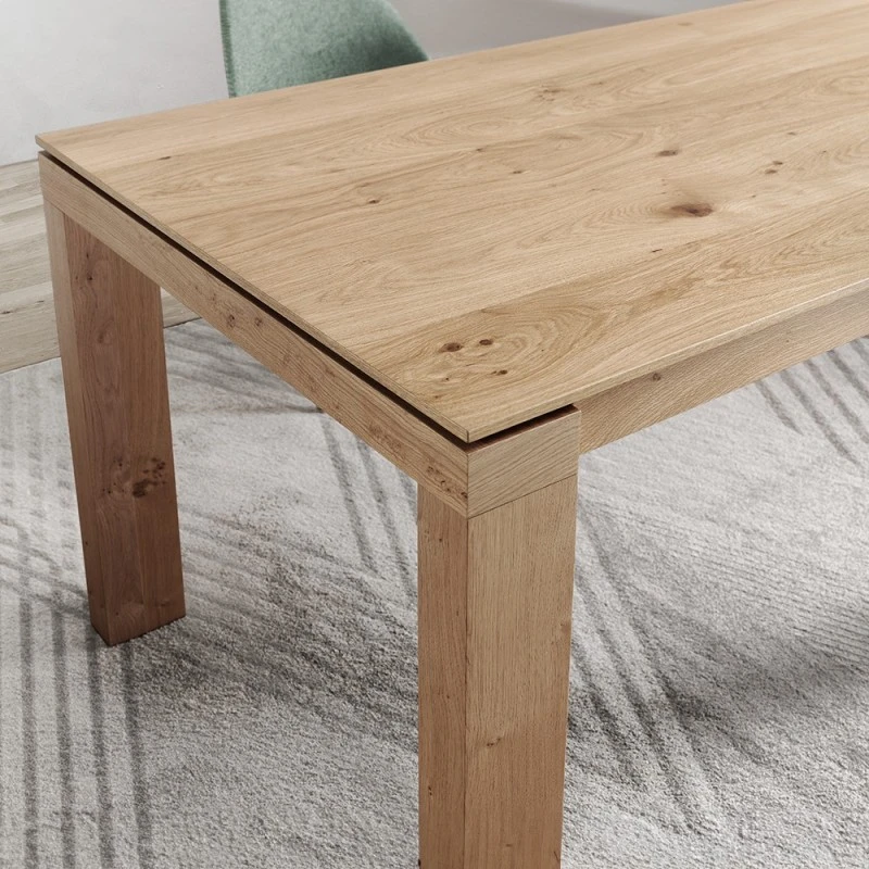 Mesa de comedor extensible de estilo moderno ARMONIA. Patas disponibles en varios acabados de madera de haya o laca y tapa en madera chapada, Dm lacado, cristal (grosor 10 mm.) o porcelánico (3 mm sobre cristal de 8 mm.); todo ello con distintos acabados.