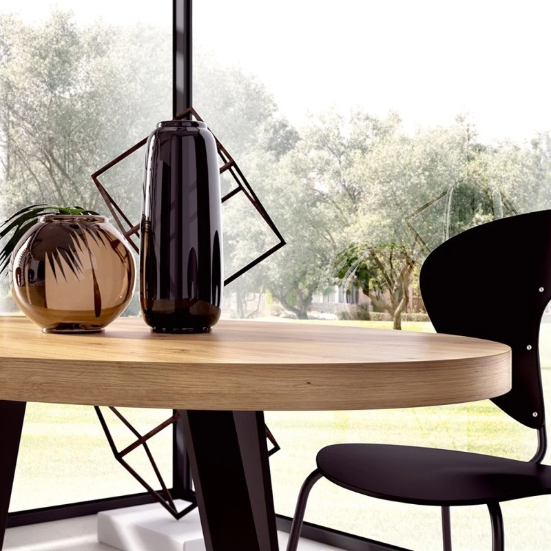 Mesa de comedor fija ovalada 160×90 cm con tapa de 5 cm de grosor en tablero de fibras recubierto de melamina de primera calidad en acabado Nordic y patas metálicas.