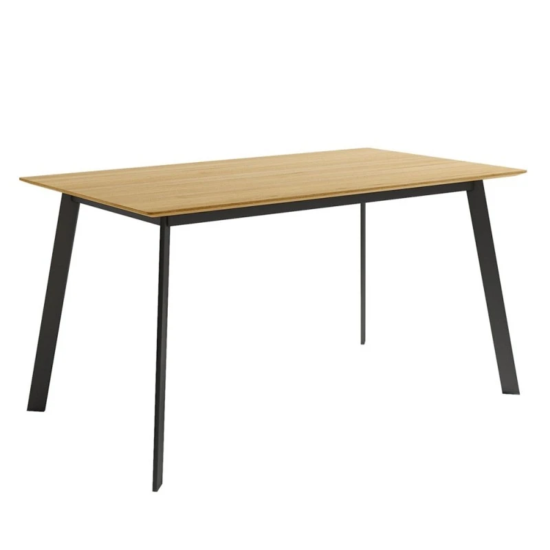 Mesa de comedor con estructura metálica negra y tapa en madera de roble con acabado natural. El sobre tiene un grosor de 19 mm.