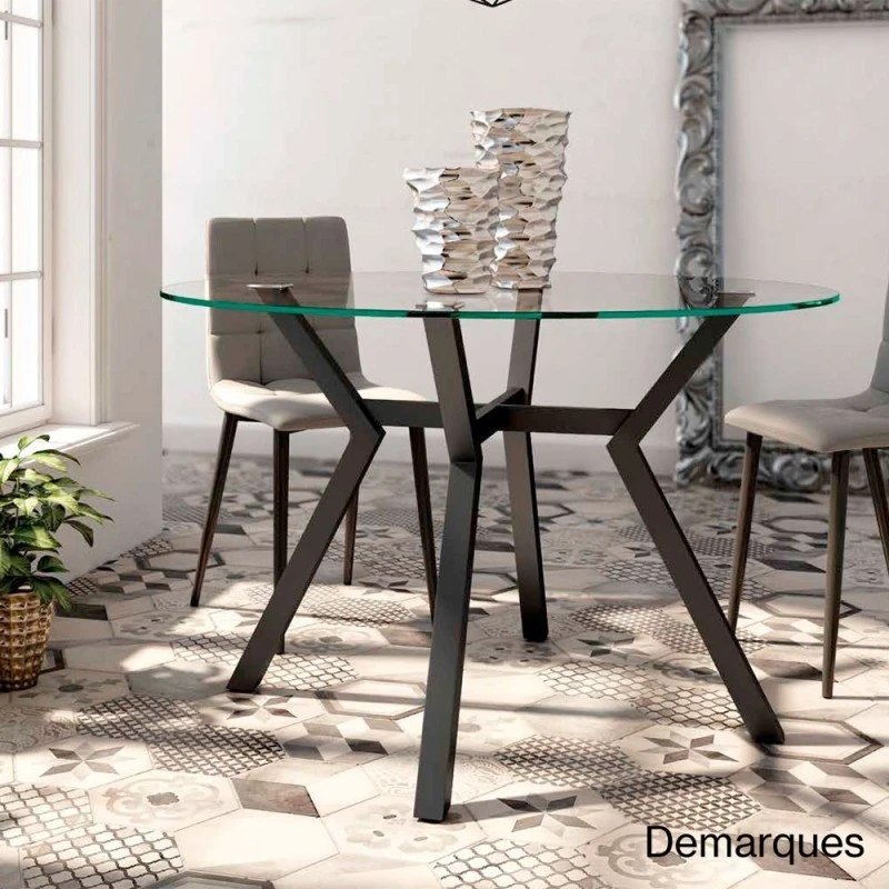 Mesa de comedor redonda de cristal con estructira metálica negra.
