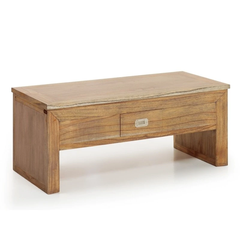 Mesa de centro de estilo colonial elevable. Fabricada en madera de mindi con acabado natural. Dispone de 1 cajón.