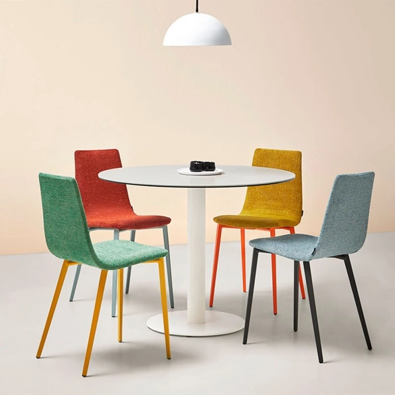 Mesa de comedor redonda con pie central metálico y tapa en porcelánico.