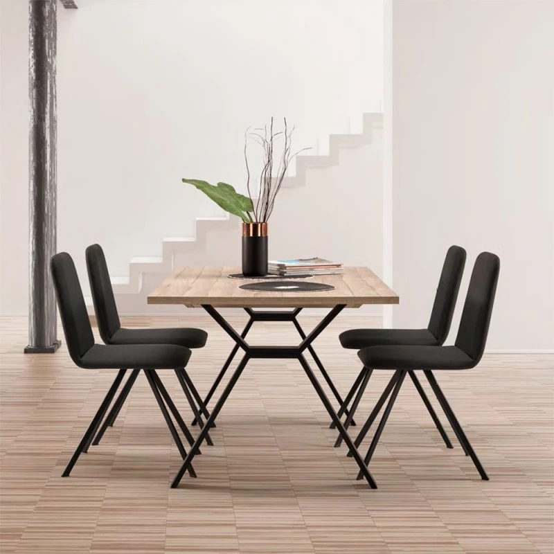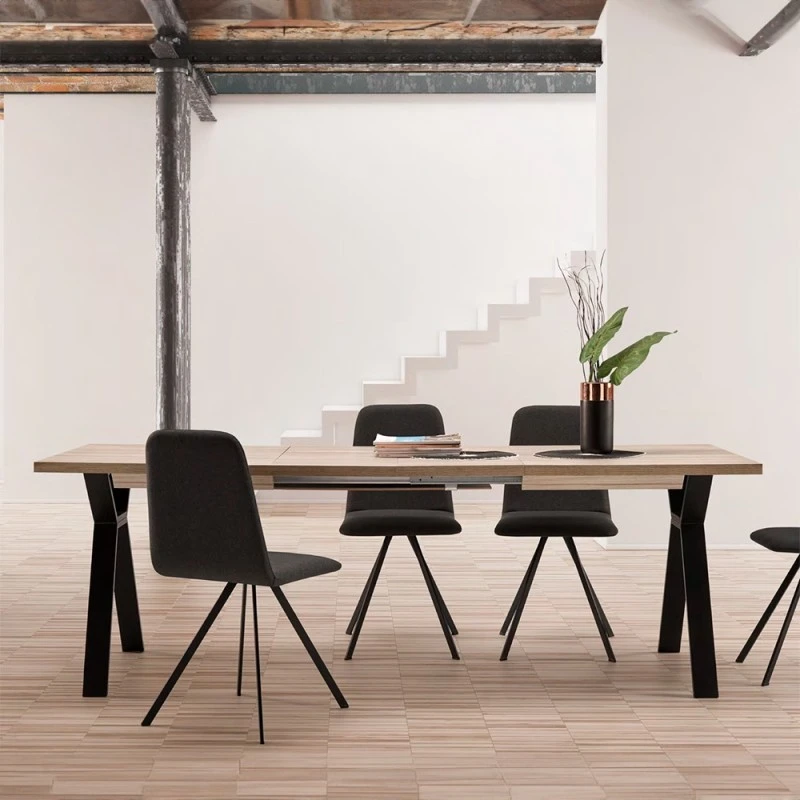 Mesa de comedor rectangular extensible. Disponible en tableros de madera aglomerada recubiertos de melamina con elección de acabado y patas metálicas.