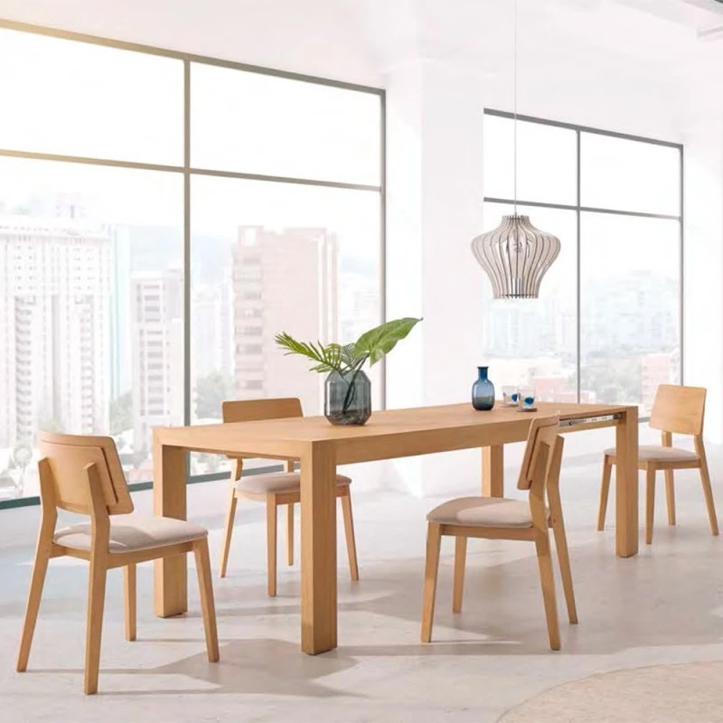 Mesa de comedor rectangular extensible. Disponible en madera chapada de roble con elección de acabado. Opción de 1 extensión de 60 cm o 2 de 40 cm.