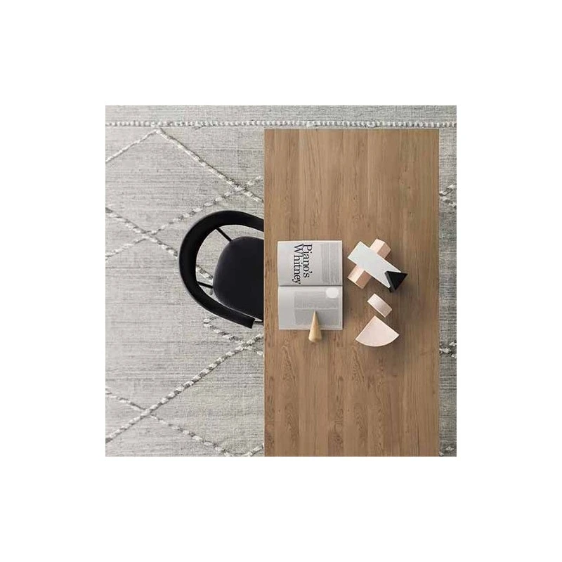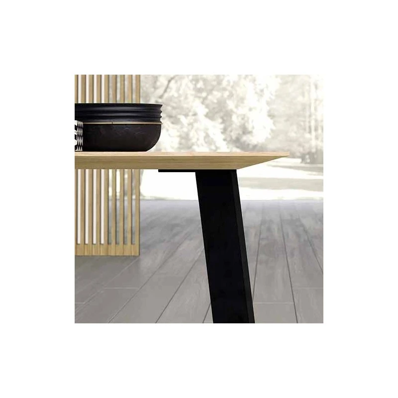 Moderna y poliédrica, la mesa de comedor Manhattan está hecha de madera maciza de roble de 3,5 cms de espesor. Caracterizada por un canto cortado de 45 grados, resulta ser ligera y muy moderna a primera vista.