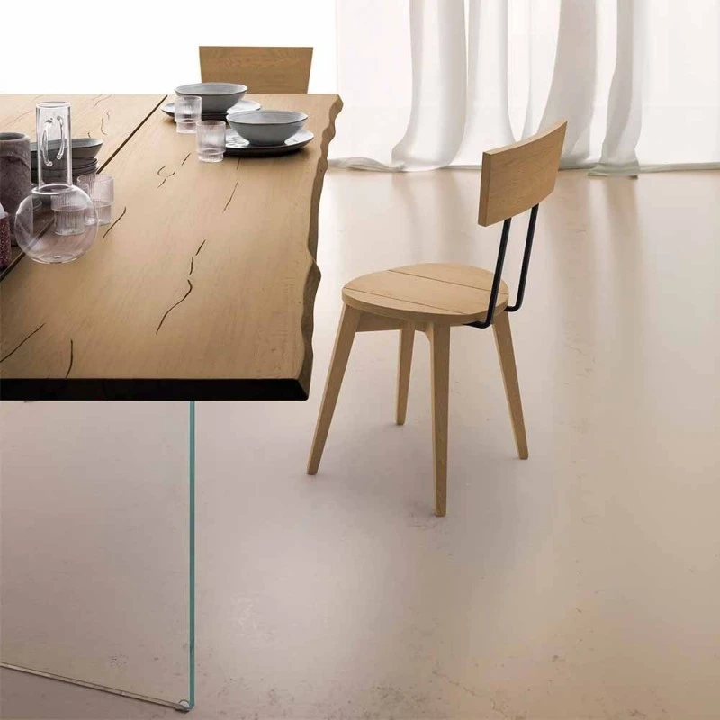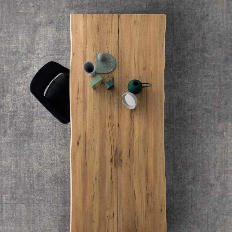 La mesa de comedor Twins se realiza uniendo dos tablas de roble macizo de 3,5 cm de espesor. Aquí, estos dos elementos y su peculiar canto irregular hacen que la encimera Twins sea capaz de infundir una naturalidad absoluta, típica de un material viviente que es la madera.