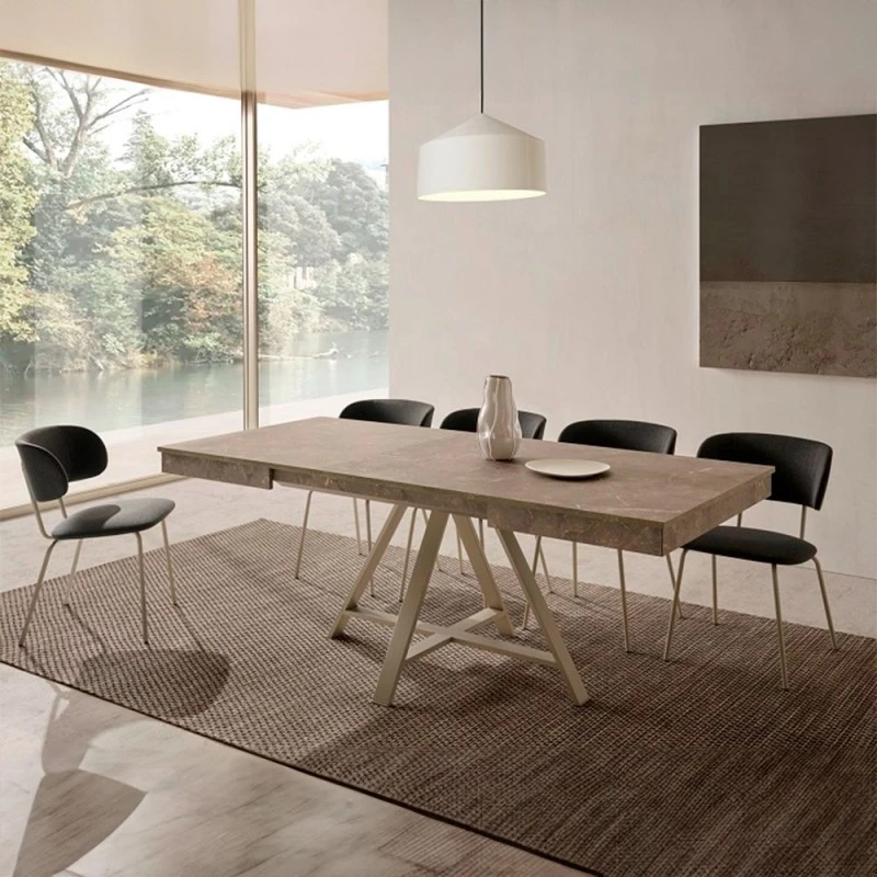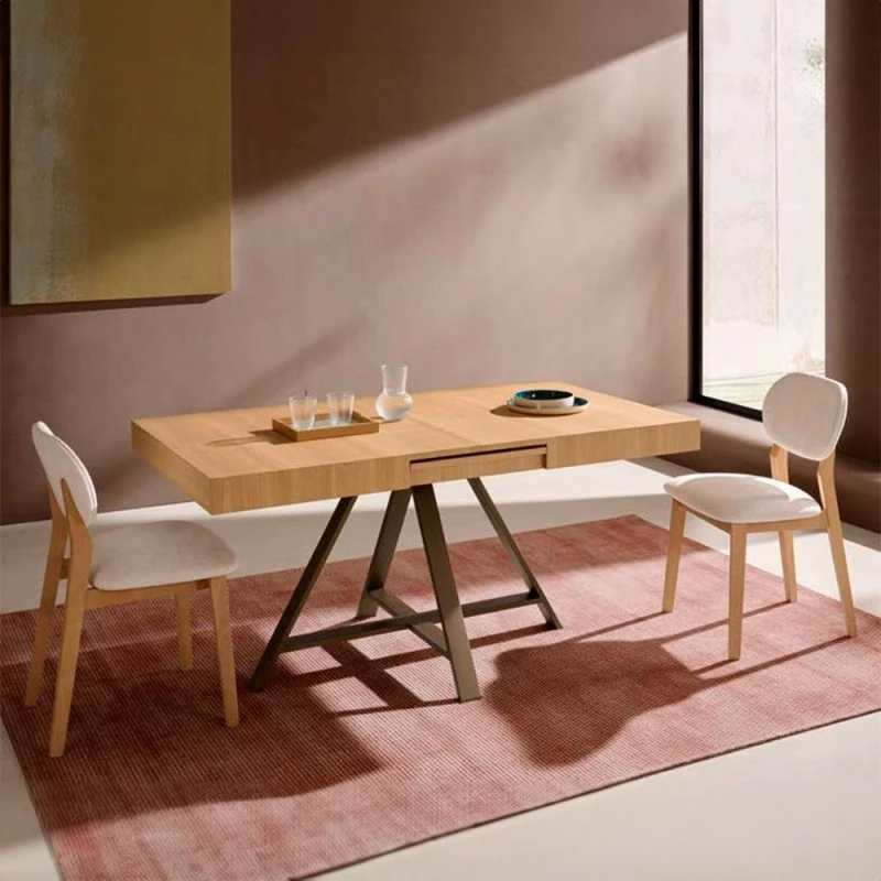 Mesa de comedor extensible con apertura automatica Olimpo. Tapara en tablero de partículas de madera recubierto de melamina. Patas metalicas con medidas 110×80 cm.