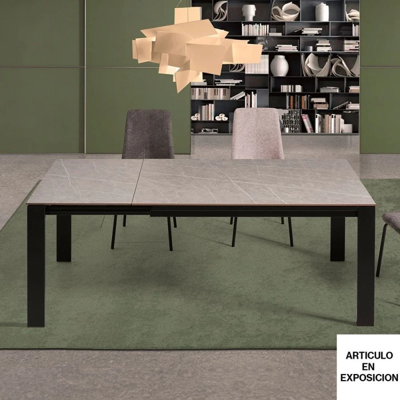Mesa extensible en porcelánico Solid gris . Extensible en el mismo cerámico que el tablero principal. Patas metálicas negras 10×2 cm