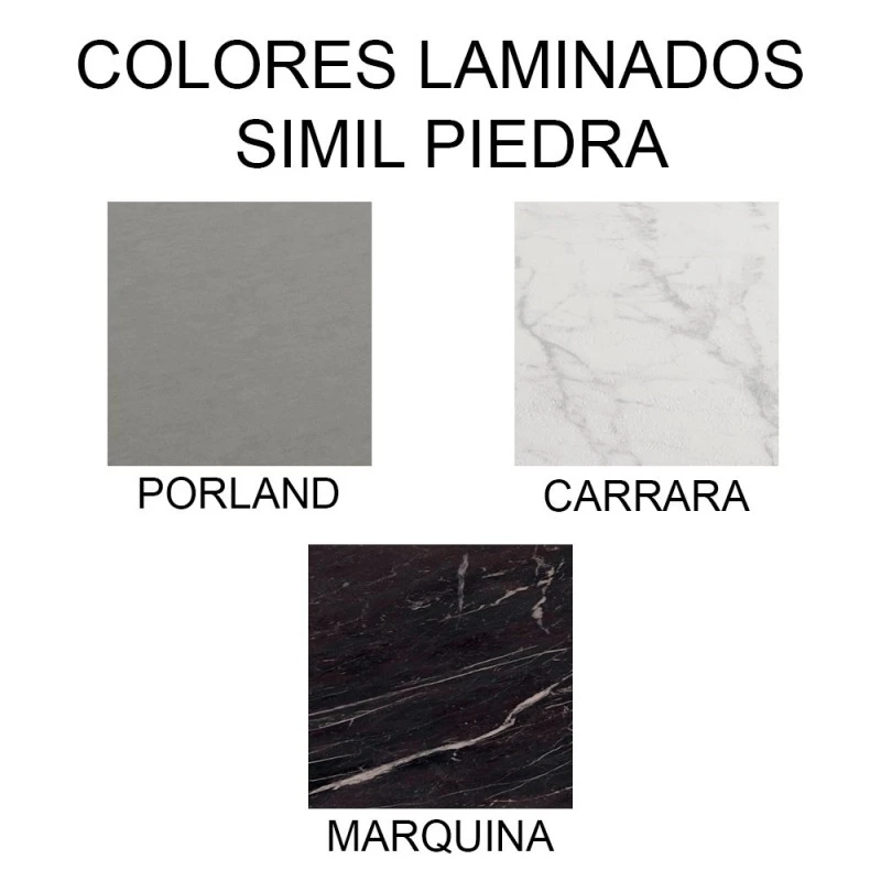 Mesa de comedor redonda extensible con tapa en tablero de MDF biselado de grosor de 25 mm recubierta de melamina acabado diseño piedra. Patas metálicas en color negro.