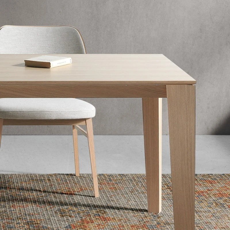 Mesa de comedor extensible de estilo nórdico Geo. Tapa en tableros de fibras chapado en madera natural; todo ello con distintos acabados. Patas en madera de haya, con acabado igualando el color de la tapa. Acabado de la foto: Roble 680 (acabado roble natural)
