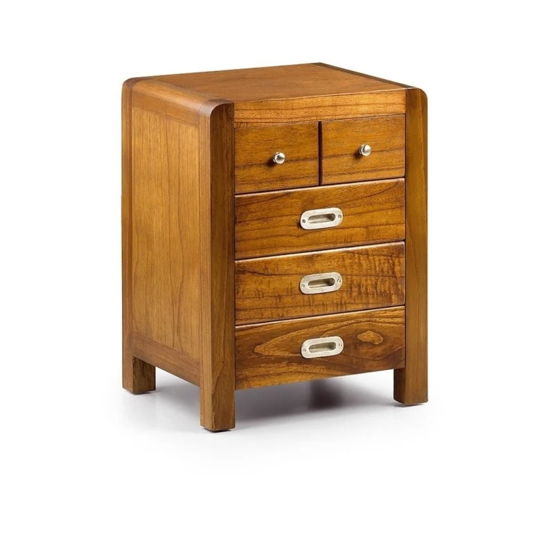 Mesa de noche de estillo colonial con 5 cajones. Fabricada en madera de mindi con acabado color roble.
