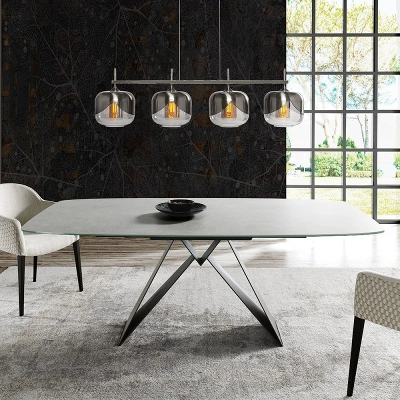 Mesa de comedor fija Infinity con tapa en porcelanico en forma de barril y patas metálicas. Estructura metálica siempre en color negro.