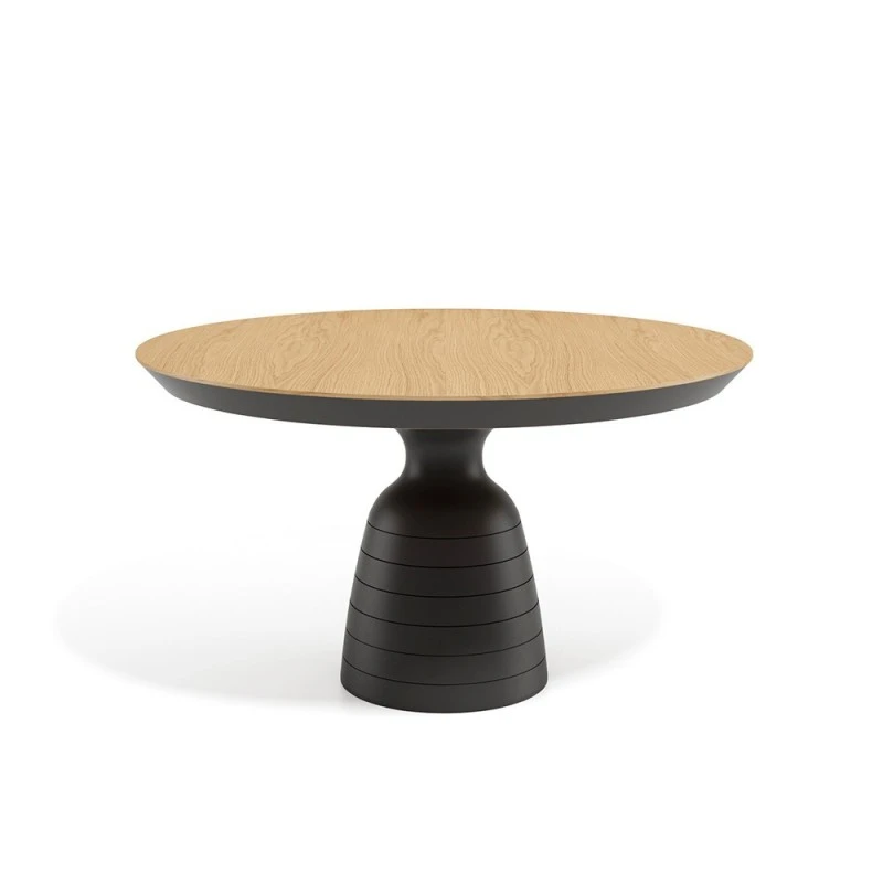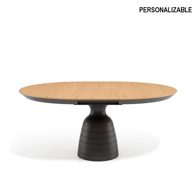 Mesa de comedor de diseño moderno con pata central forma de campana en madera lacada a poro abierto. Tapa disponible en roble, roble con nudos o nogal.
