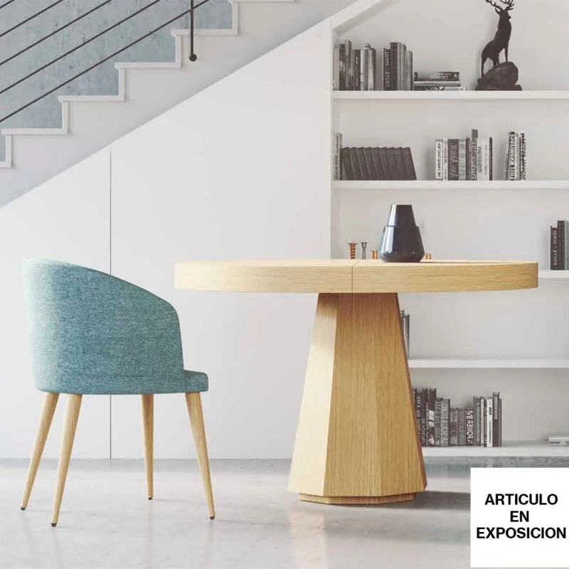 Mesa de comedor extensible de diseño nórdico Oslo con pata central. Fabricada en tableros de MDF chapados de madera de roble con acabado natural.