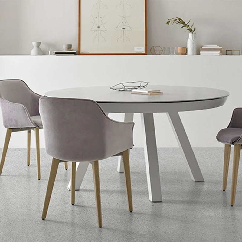 Mesa de comedor redonda Esla con tapa en porcelánico. Patas metálicas cion amplia variedad de colores de lacado.