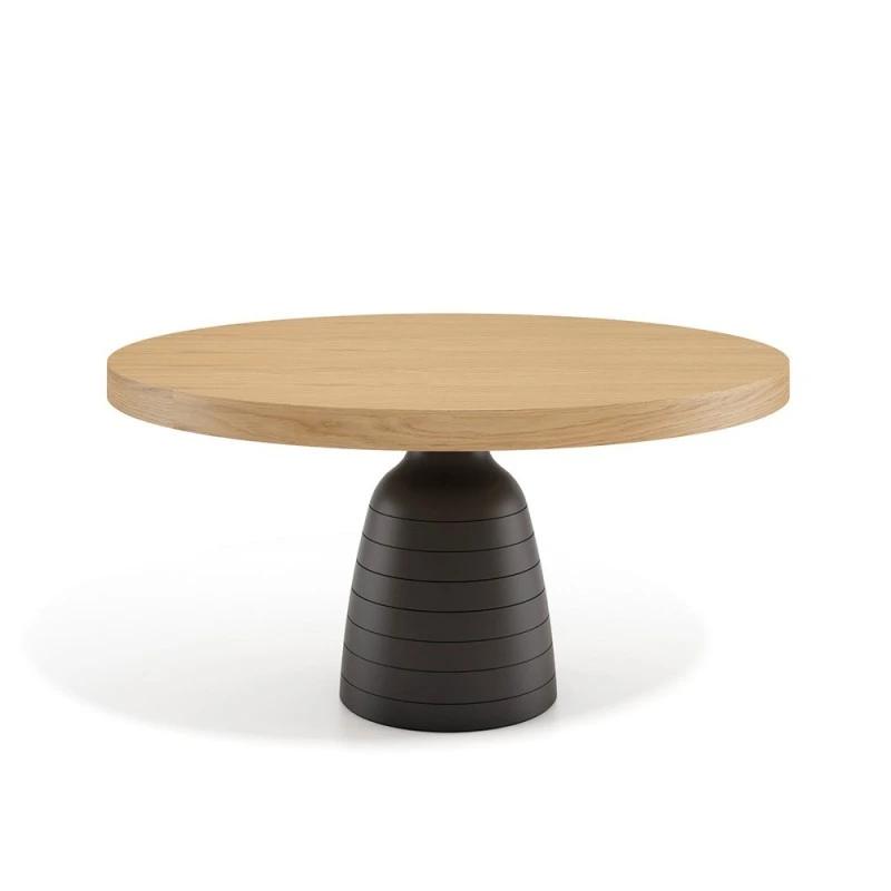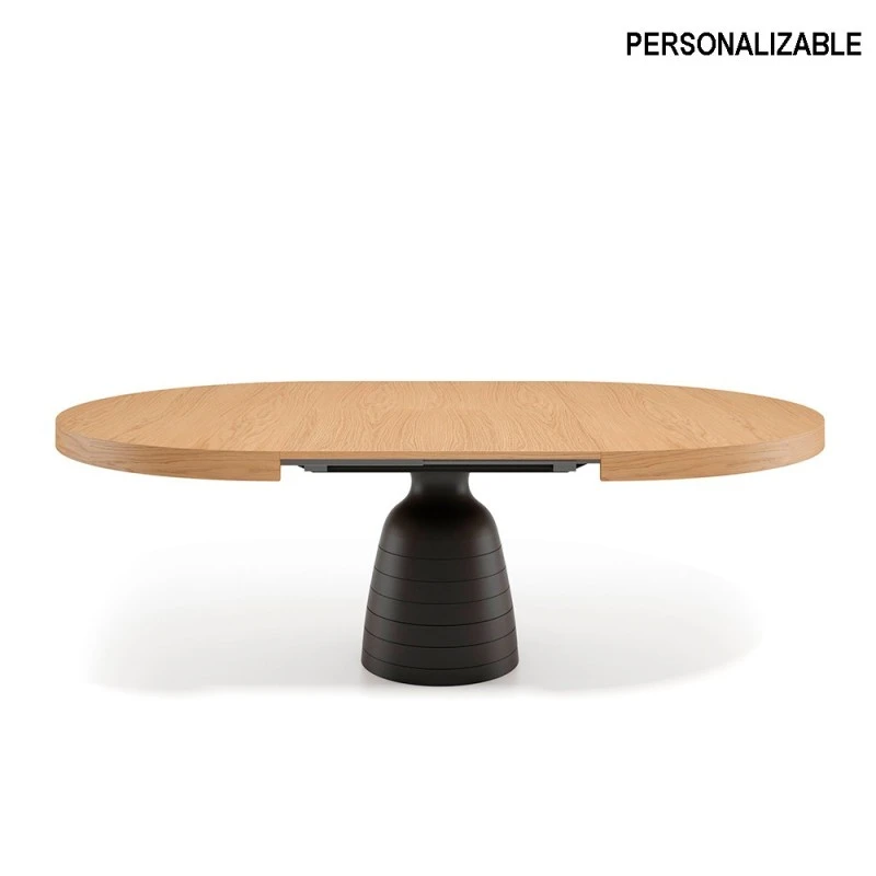 Mesa redonda extensible pie central. Tapa en roble, roble con nudos o nogal. Pata en madera lacada a poro cerrado en distintos colores.