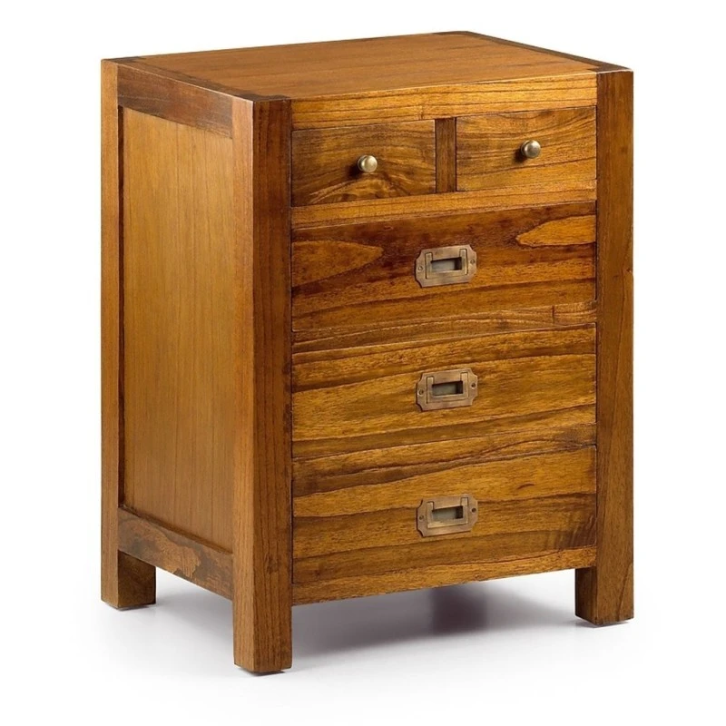 Mesa de noche de madera de estilo colonial con 5 cajones. Fabricada en madera de mindi.