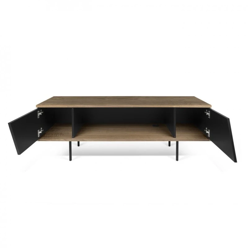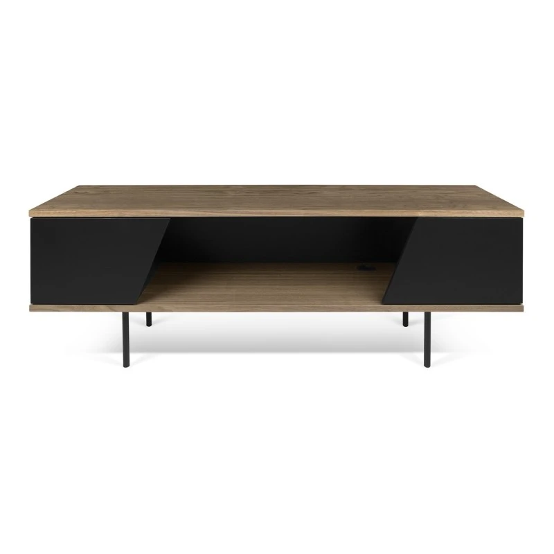 Mueble de Tv de televisión de dos tonos con puertas de corte diagonal en negro mate sobre un marco de chapa de nogal.