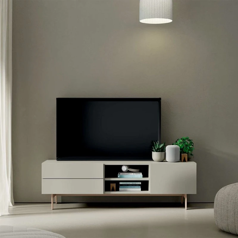 Mueble de Tv de 150 cm en acabado lacado Arena mate, con 2 cajones + 2 huecos y 1 puerta abatible. Estructura metálica con 4 patas en acabado lacado sésamo.