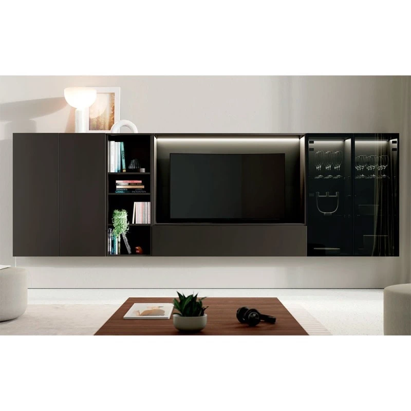 - 1 Estantería colgar. 150×31,7×90. Taiga mate. Luz con mando para estantería colgar.