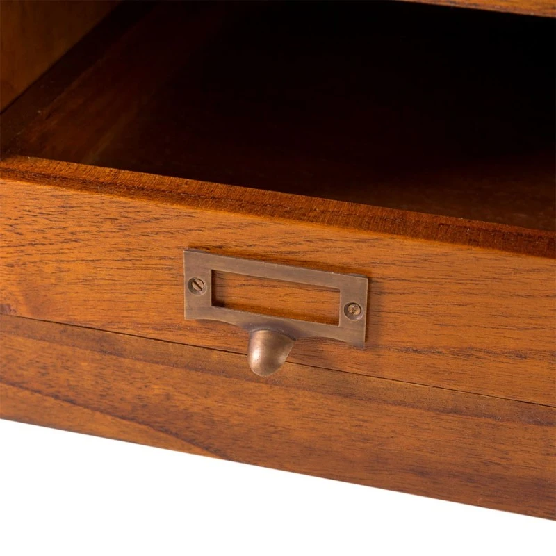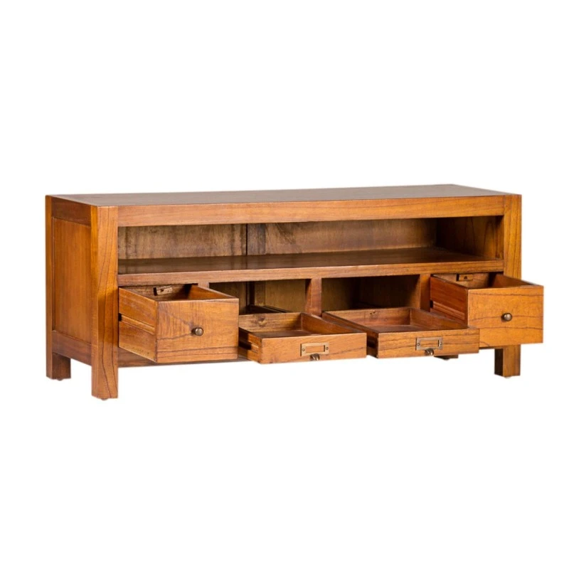 Mueble de Tv de estilo colonial con 4 cajones y 1 hueco. Fabricado en madera de mindi.