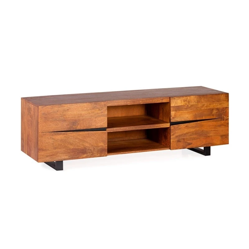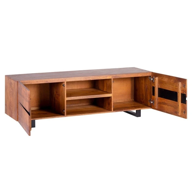 Mueble de Tv en madera maciza de mango con 2 puertas y 2 huecos. Detalles decorativos en metal color negro.