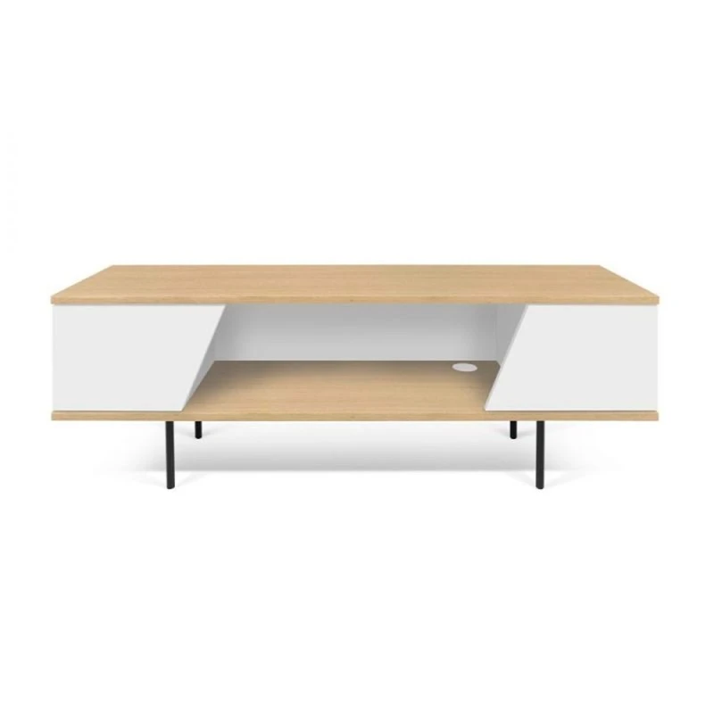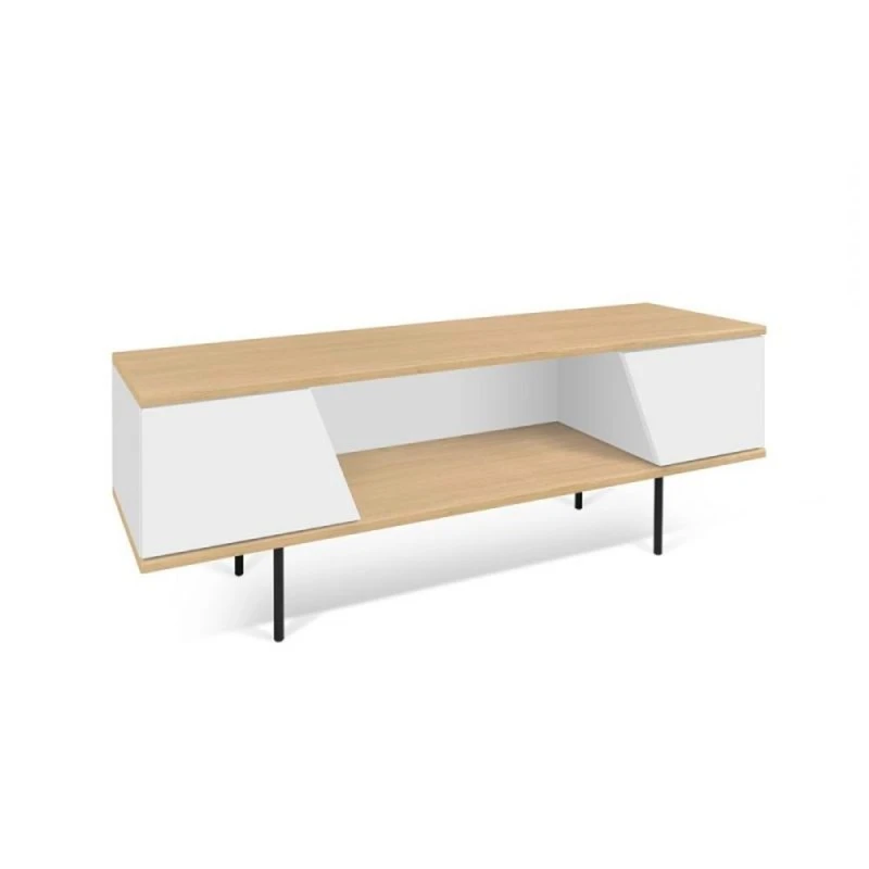 Mueble de Tv de televisión de dos tonos con puertas de corte diagonal en blanco mate sobre un marco de chapa de roble.