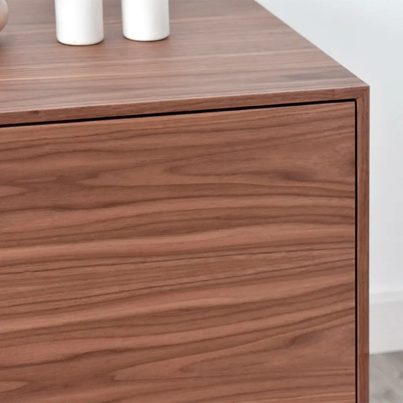 Mueble TV de madera de estilo nórdico con 2 cajones y 3 puertas con el frente liso. Disponible en madera chapada de roble natural, roble anudado, roble dark o nogal. Cajones en acabado textil