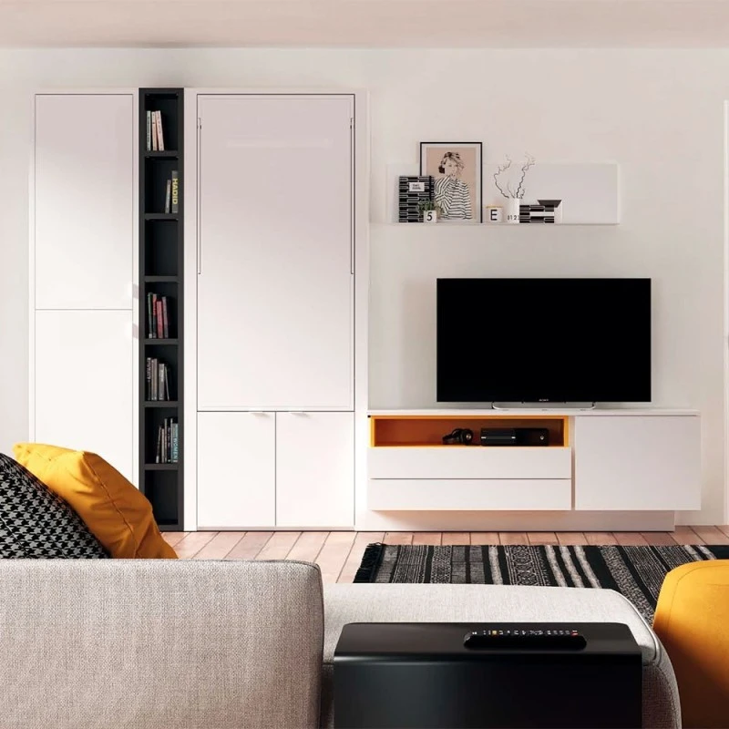 Salón de diseño nórdico Muss de la firma Tegar Mobel con mueble de Tv y mesa abatible.