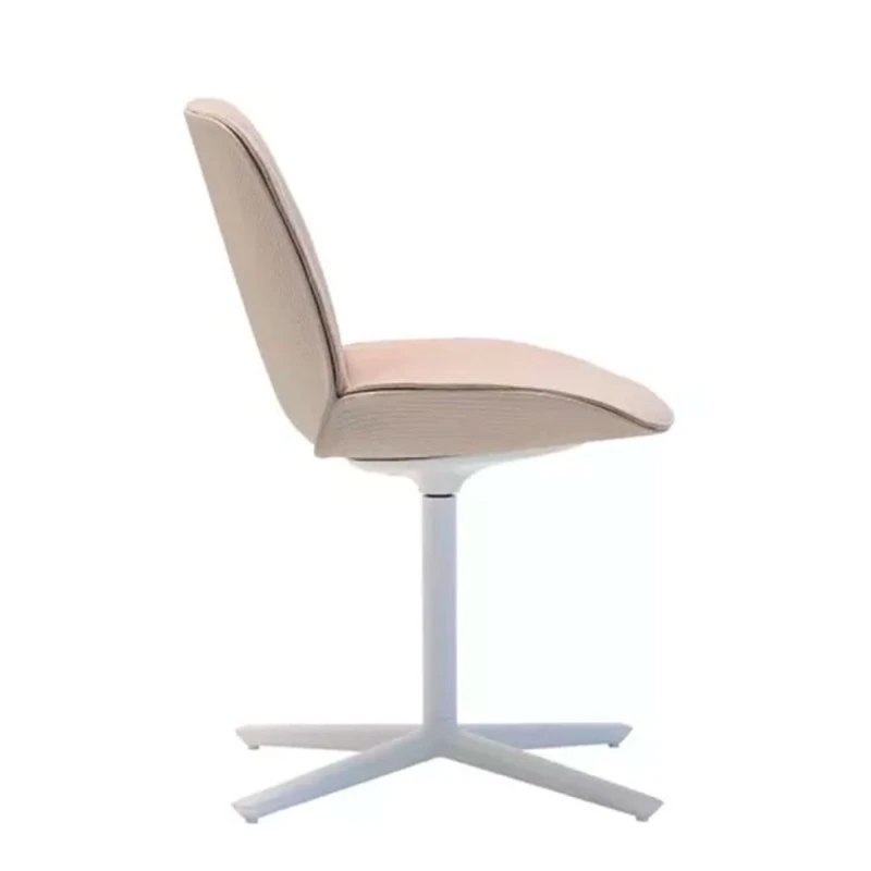 Silla con carcasa de termopolímero Eco disponible en diferentes colores o termopolímero Pure Eco (100% reciclado) disponible en color arena y base central giratoria de aluminio de 4 aspas con sistema de retorno en acabado aluminio pulido, blanco o negro. Opción de asiento plafonado o asiento y respaldo plafonados.