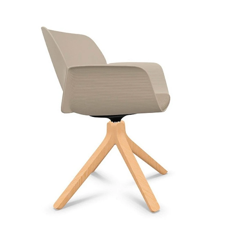 Sillón con carcasa de termopolímero Eco disponible en diferentes colores o termopolímero Pure Eco (100% reciclado) disponible en color arena y base central giratoria de 4 aspas de madera maciza de fresno con sistema de retorno. Asiento plafonado.